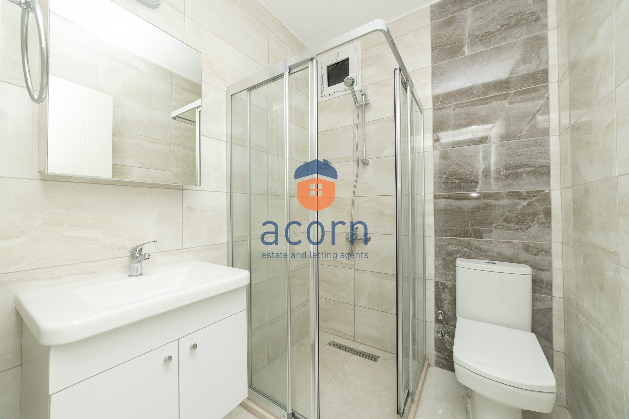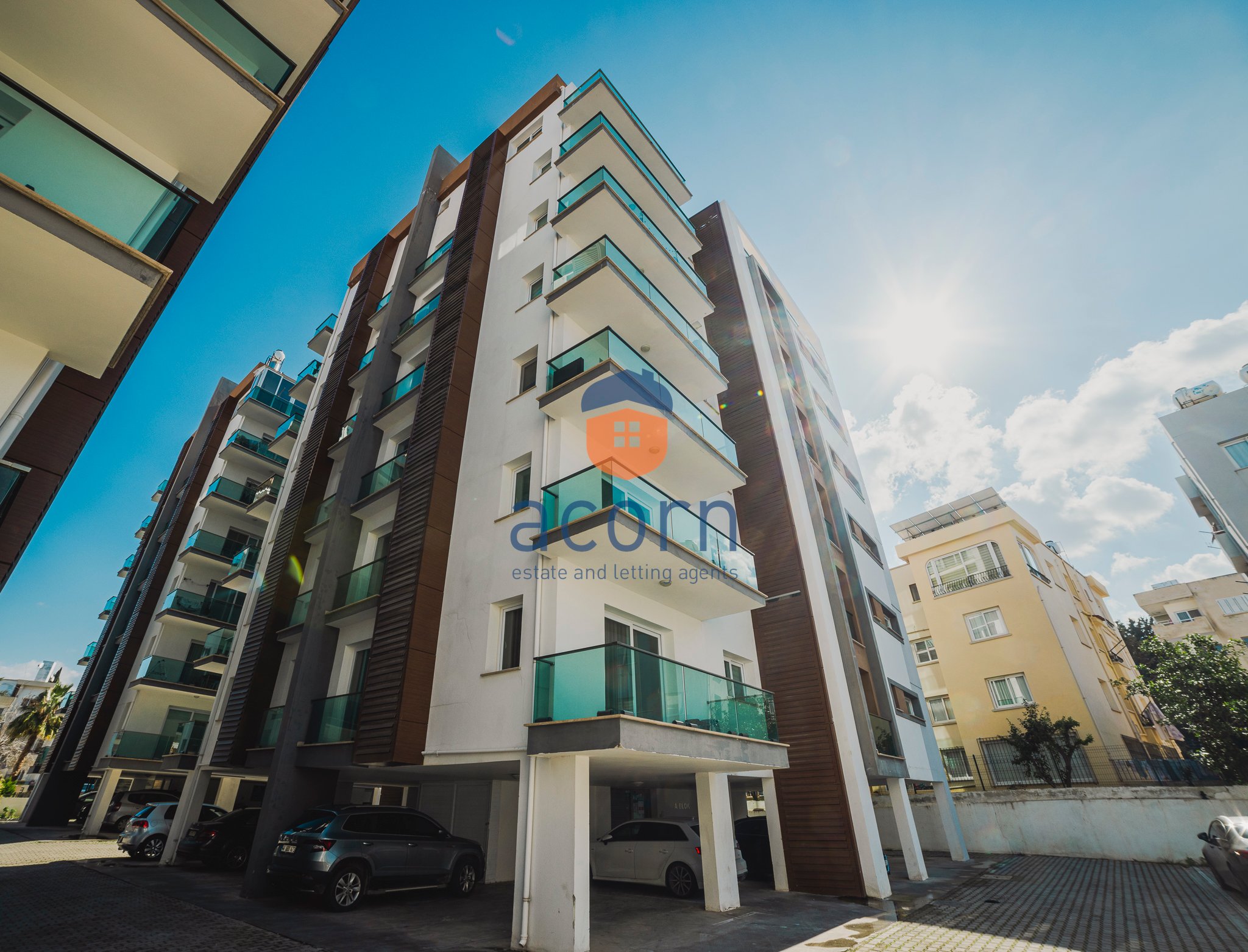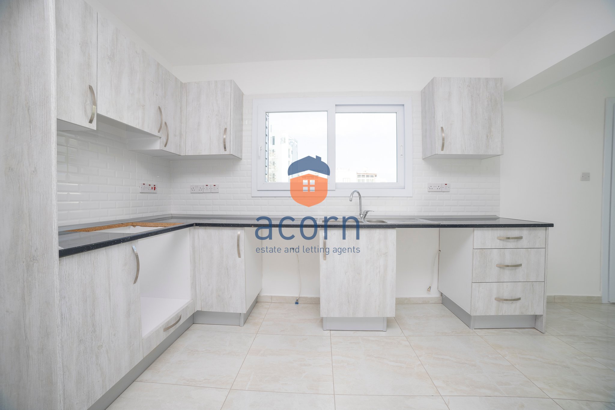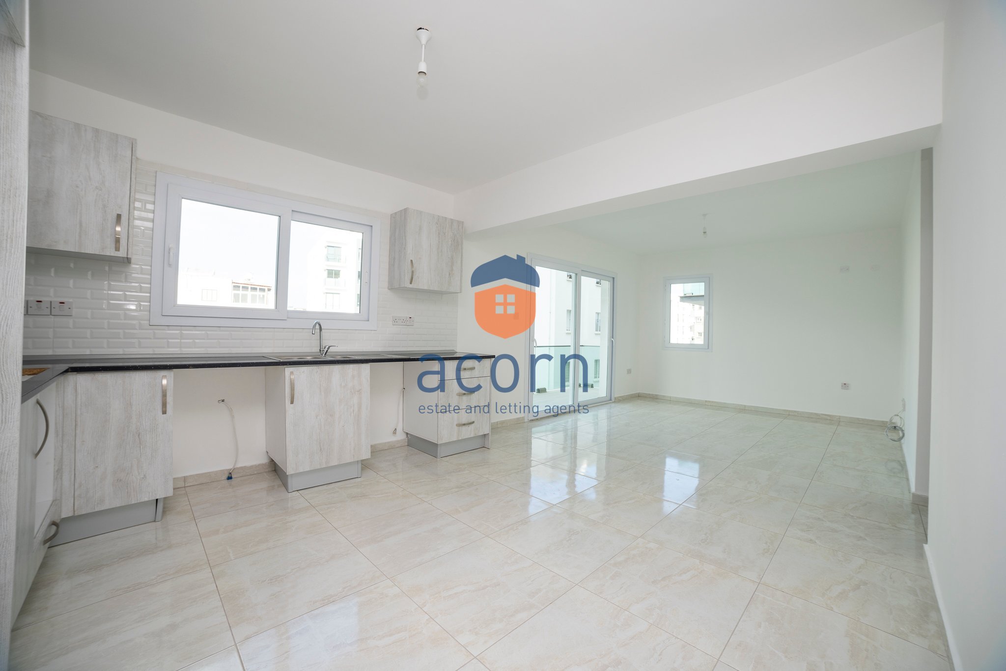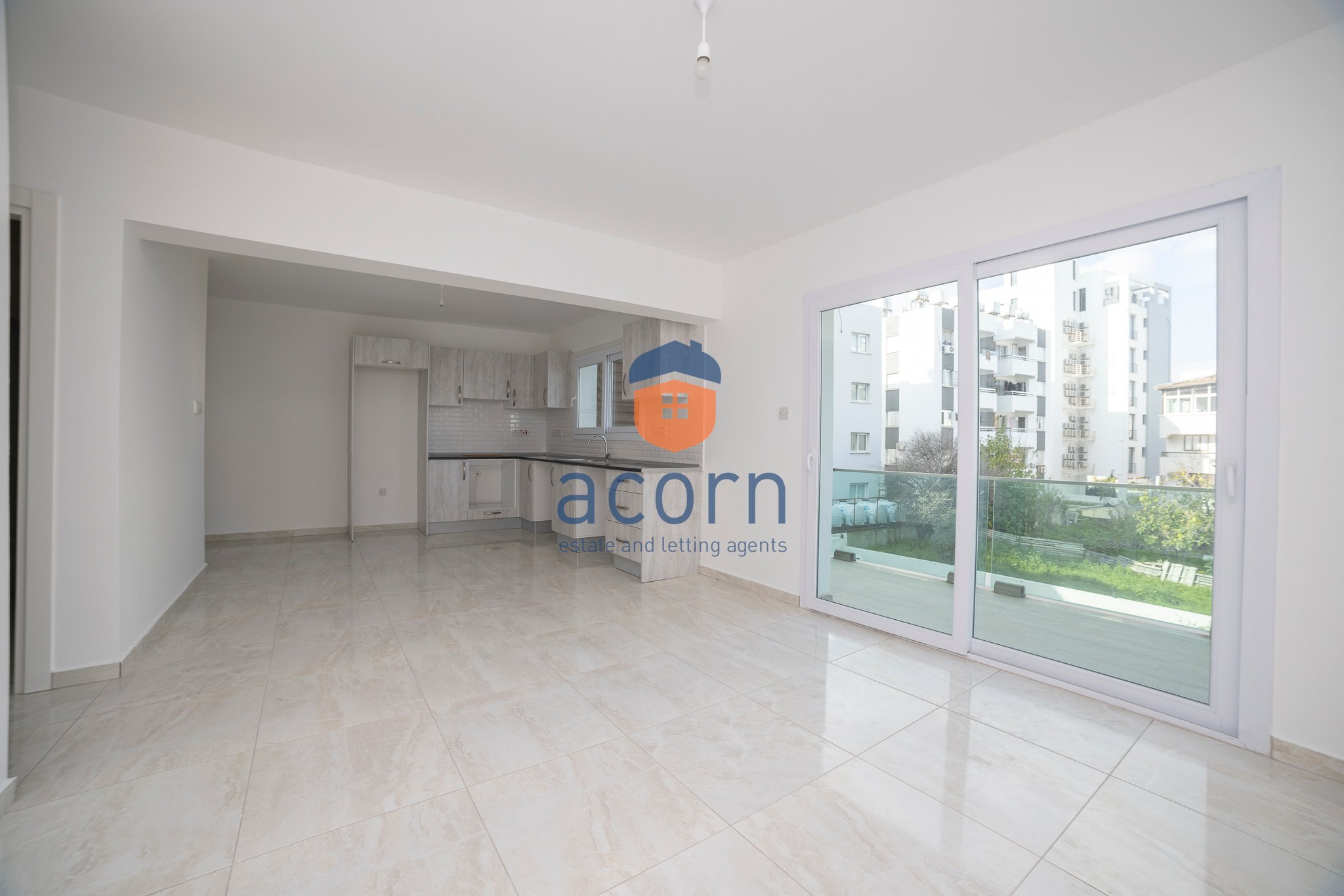 - Open-plan living space with modern kitchen and balcony