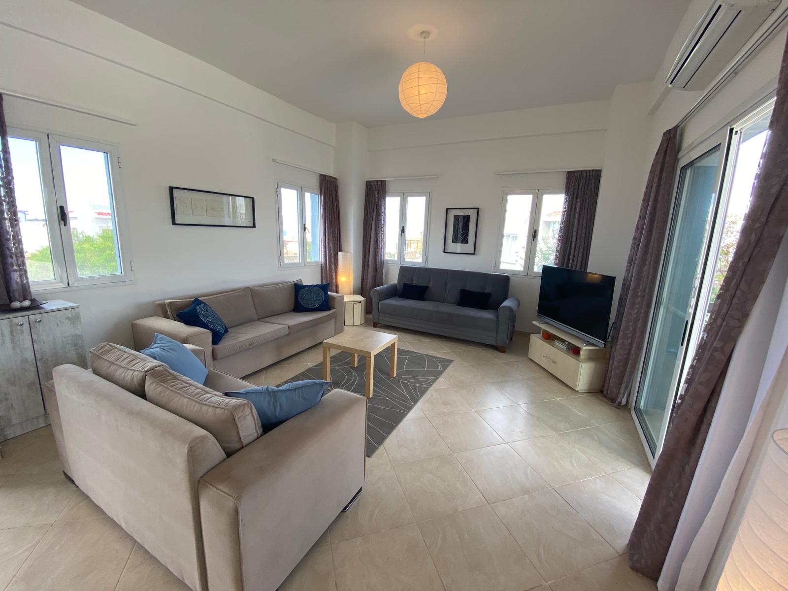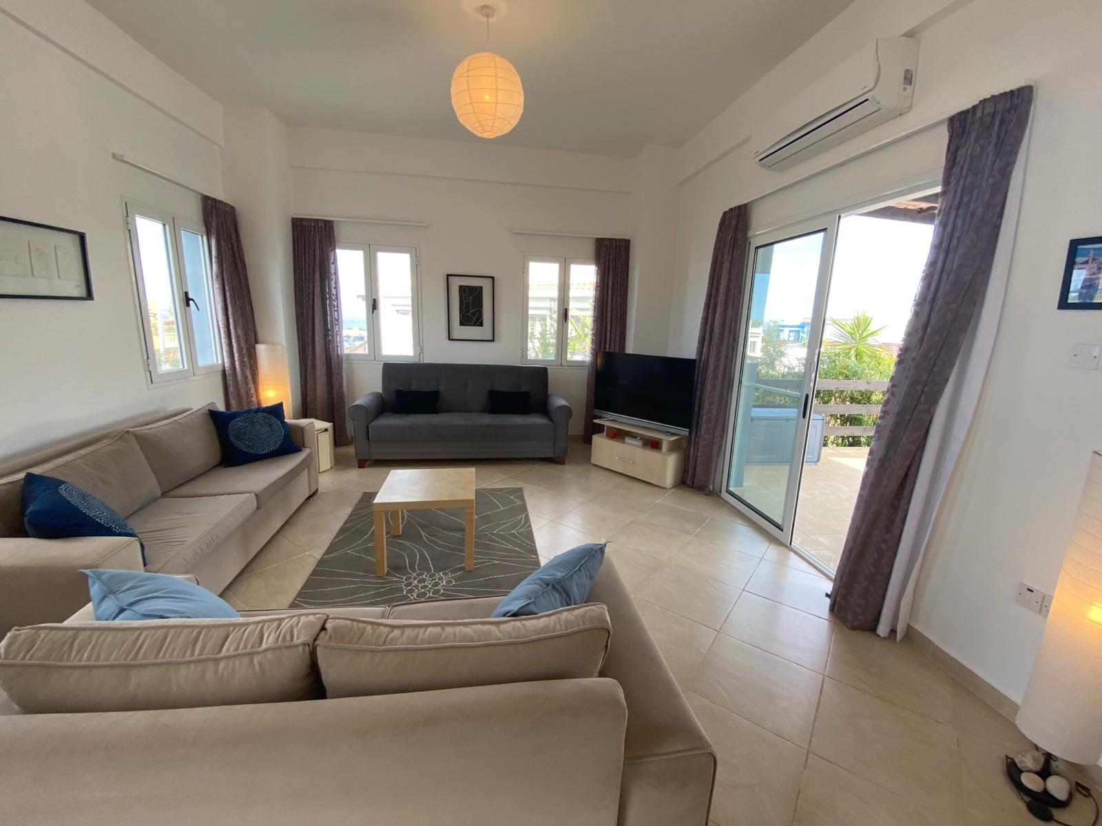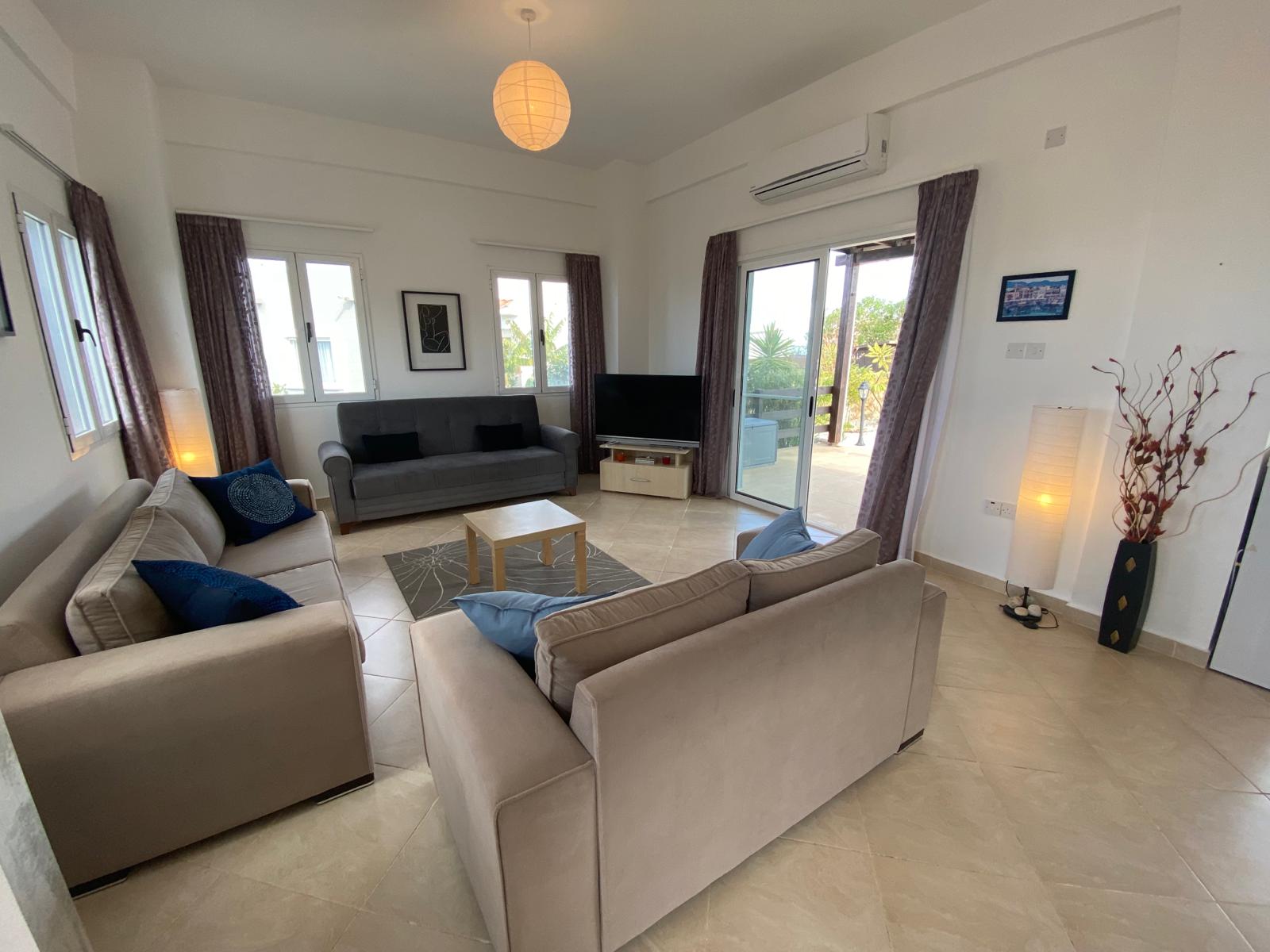 - Bright living room with patio doors to terrace