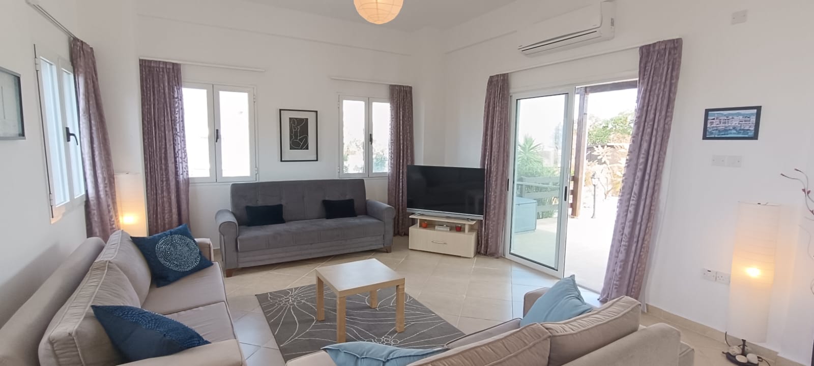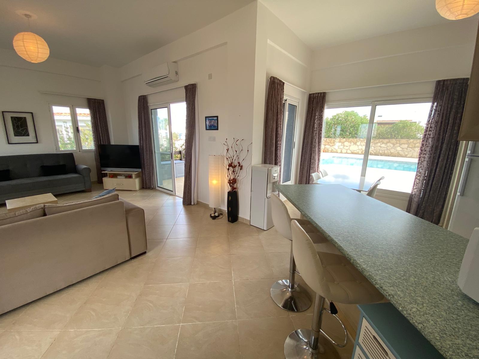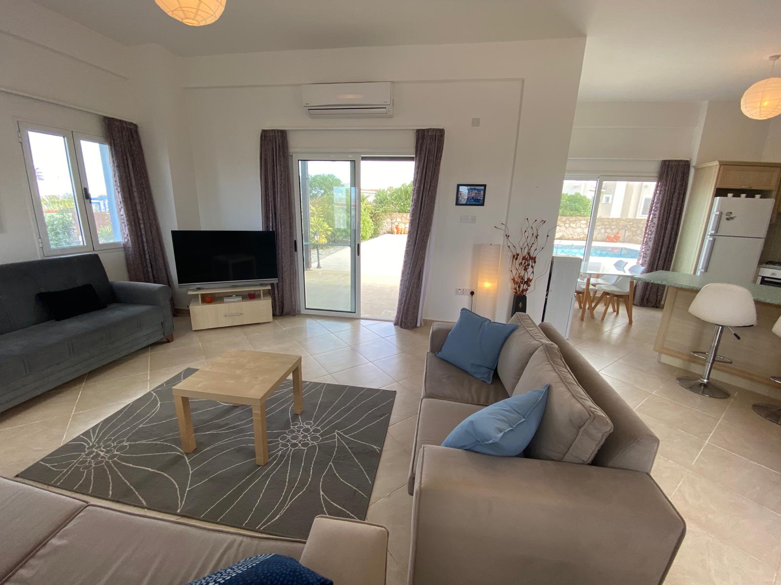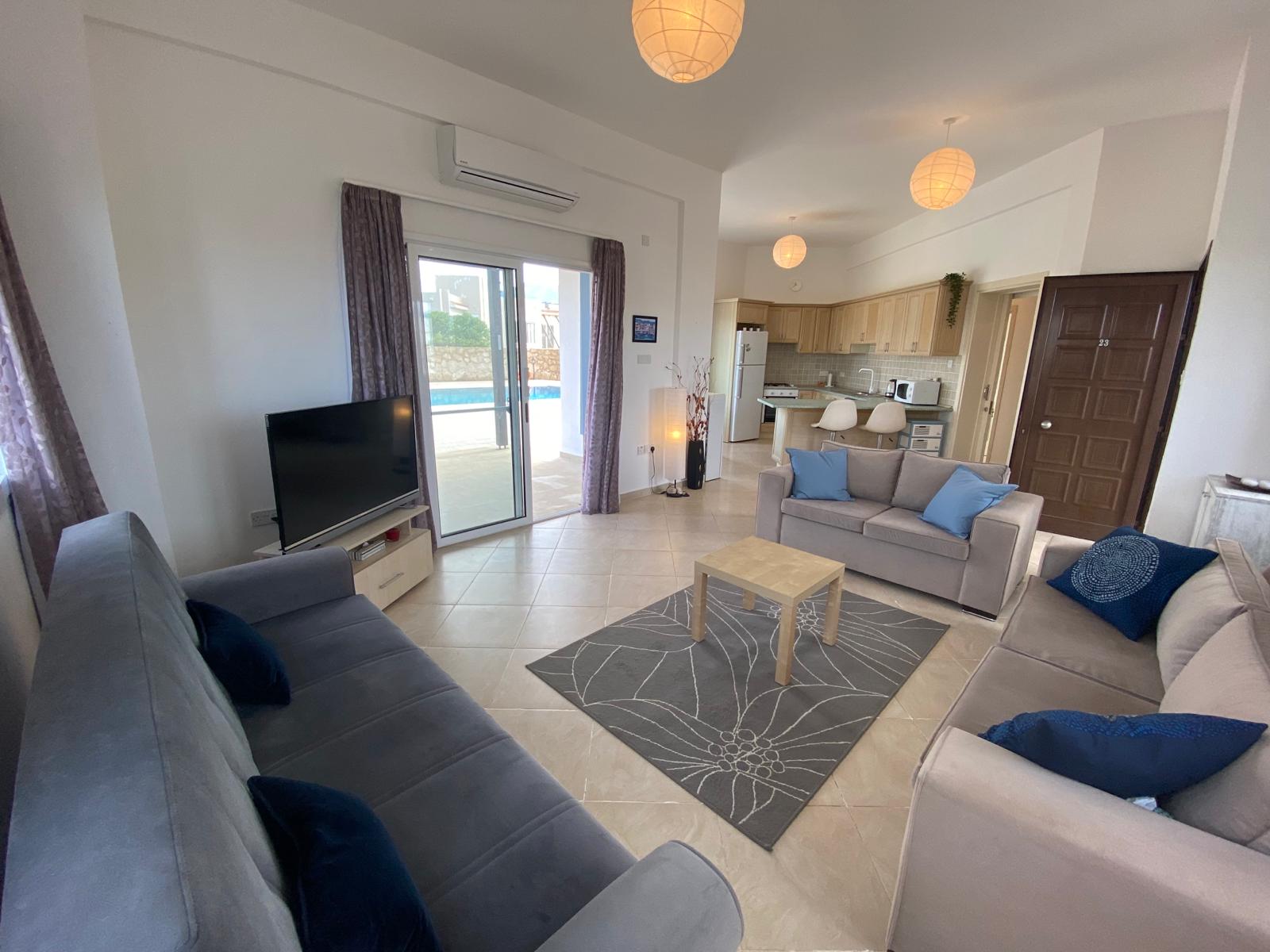 - Bright living room with patio doors to terrace