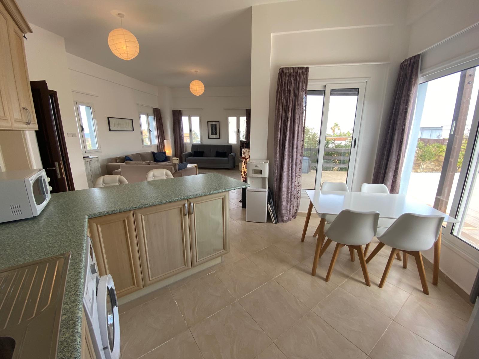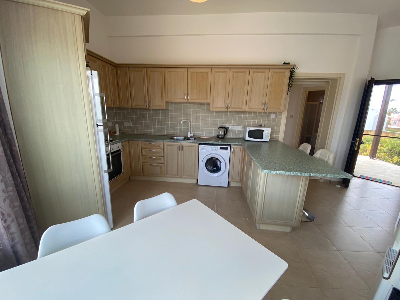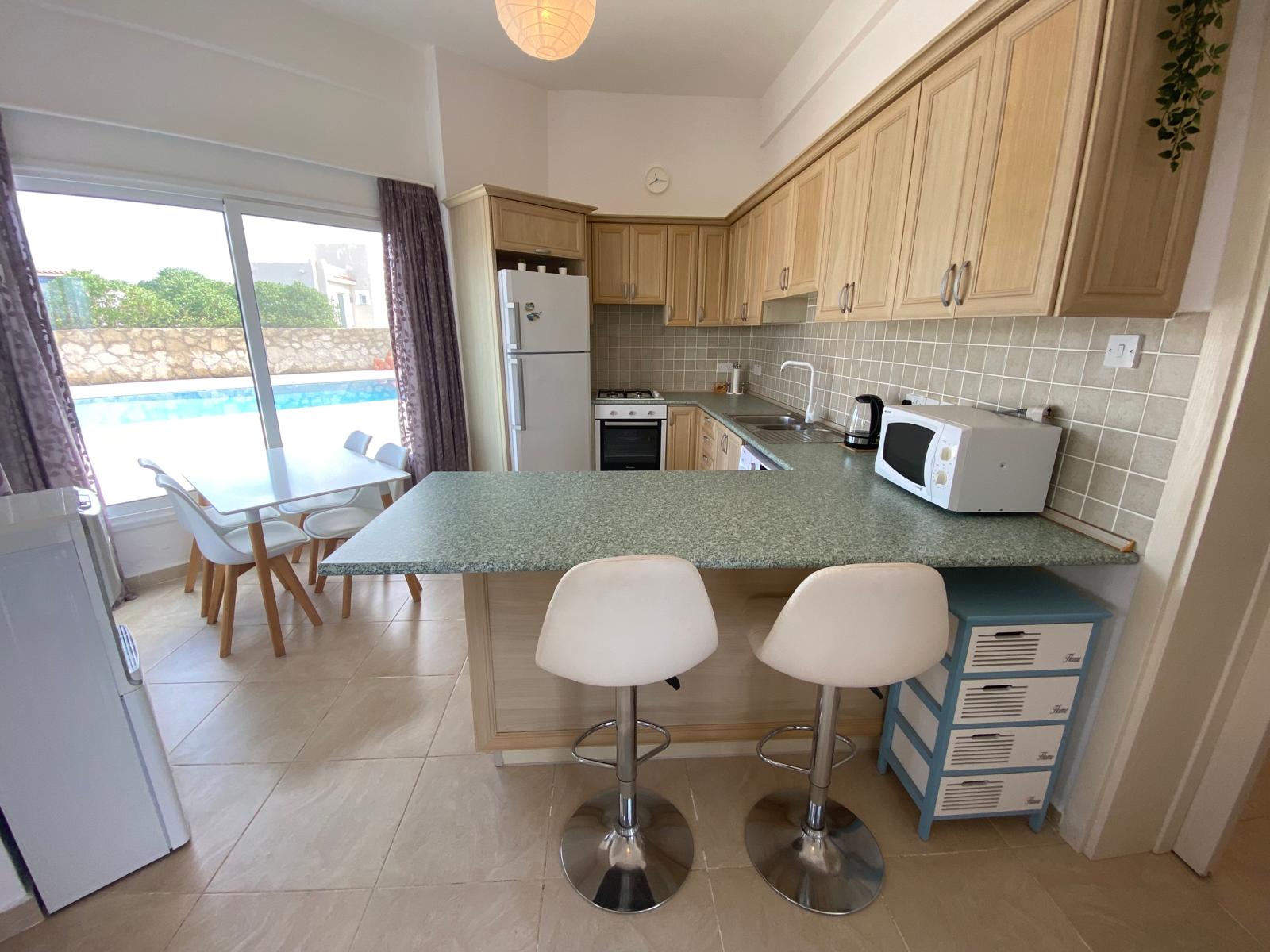 - Kitchen with white goods and breakfast bar
