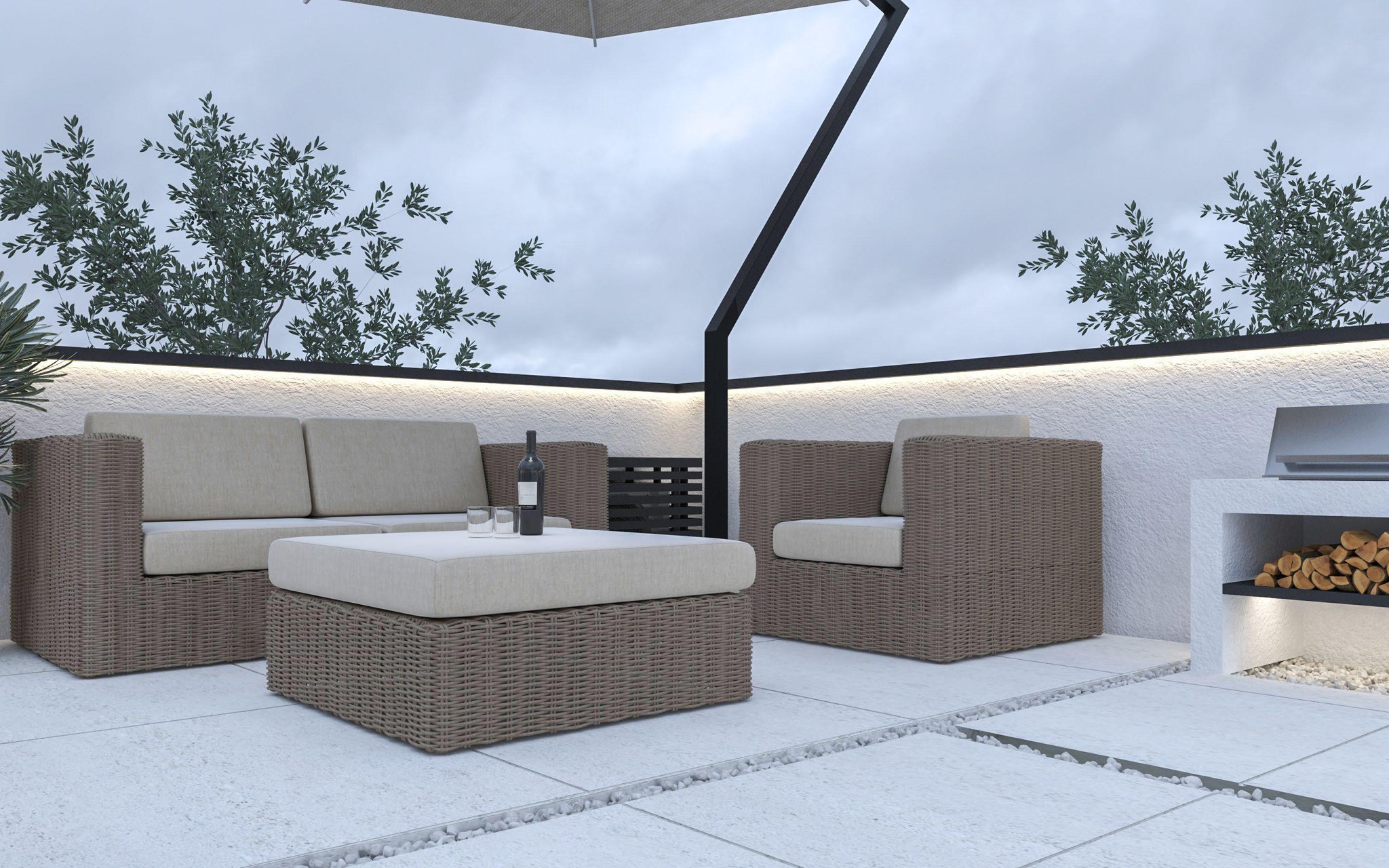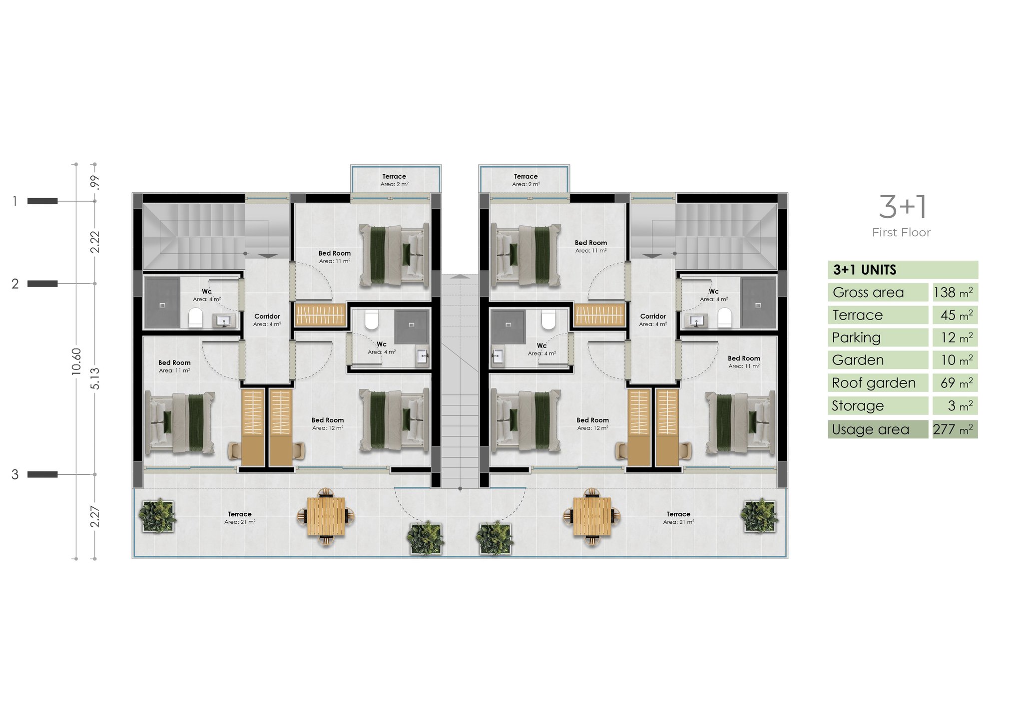 • • Living Area: 138m² | Roof Garden: 69m² | Terrace: 45m² |Garden: 10m² | Indoor parking: 12m² | Storage room: 3m² | Total: 277m²