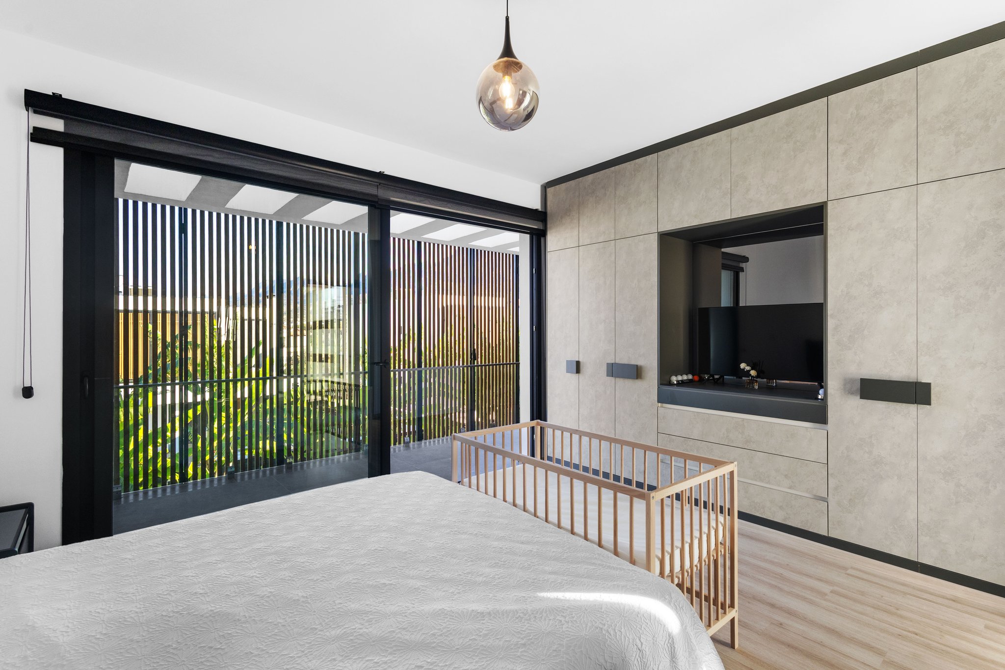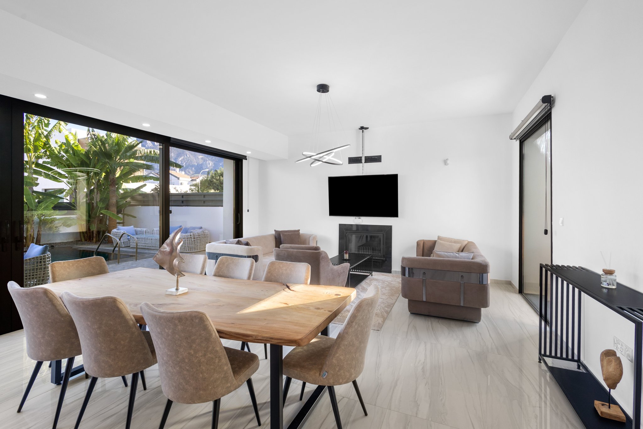 - 🌞 Spacious open-plan living area with floor-to-ceiling sliding glass doors and feature cast-iron fireplace