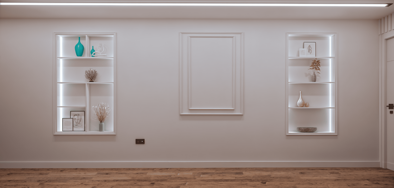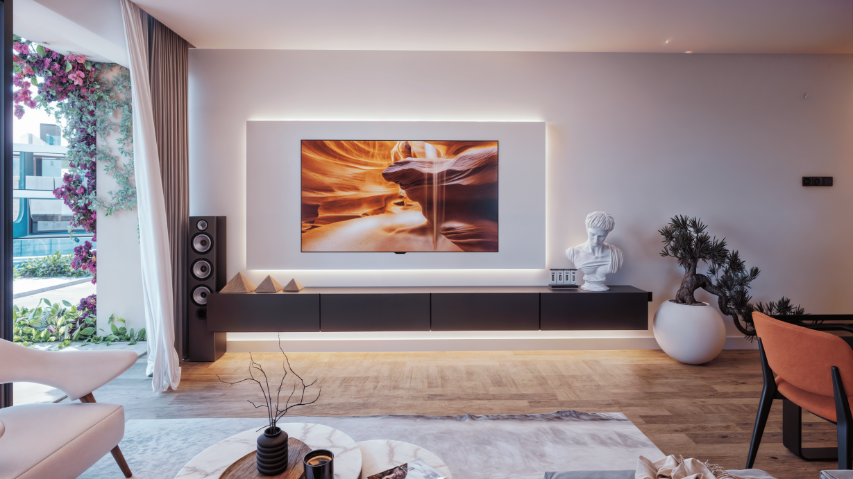 - Open-plan living space with TV unit and bookcase and modern kitchen with oven and extractor fan