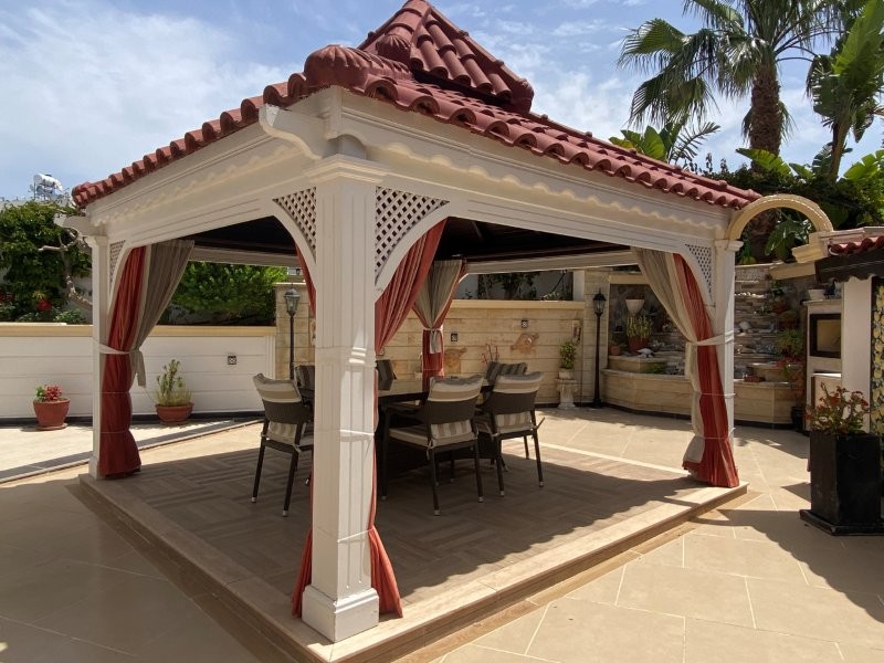 • • Extensive outdoor entertaining areas, including covered terraces, outdoor kitchen with barbecue, bar, and gazebo with hot tub.